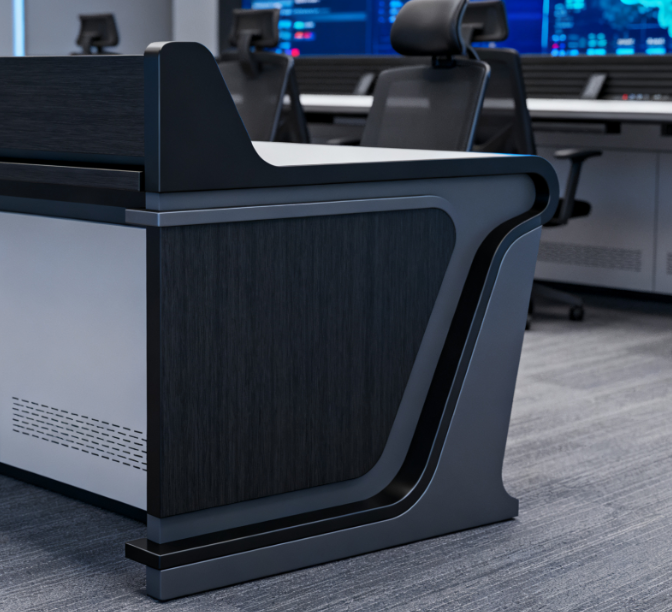 台面采用25mm新型环保板材,以高分子聚合热化学反应方式成板,不释放甲醛,拥有美国CARB无醛豁免认证。表面粘贴接美国威盛亚系列高级HPL,HPL是由进口牛皮纸经过含浸,烘干,高温高压的环境压制而成。具有耐潮、耐热、抗刮、耐烟灼、不滋生霉菌、易清理、使用寿命长等卓越特性。 台面前端采用聚氨酯加模压成型的手枕边,保证手臂工作时的舒适性,具有良好的抗刮,耐磨及耐腐蚀效果,可满足人员长期24小时工作带来的相关磨损。 拼合缝隙采用无缝拼接。