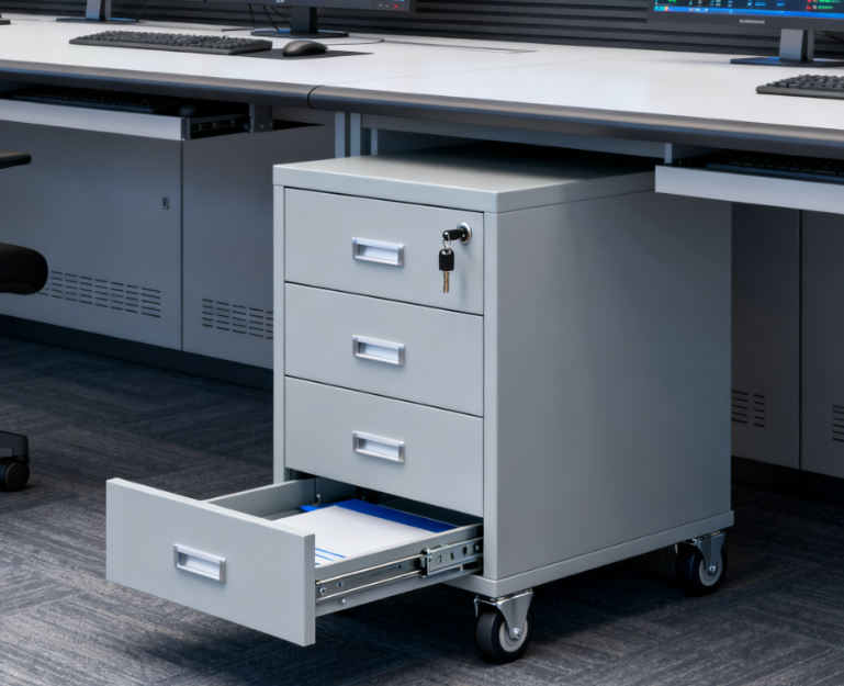 台下文件柜,移动式,灵活方便,带锁三抽屉,配静音滑动导轨。65mmPU滑轮,
